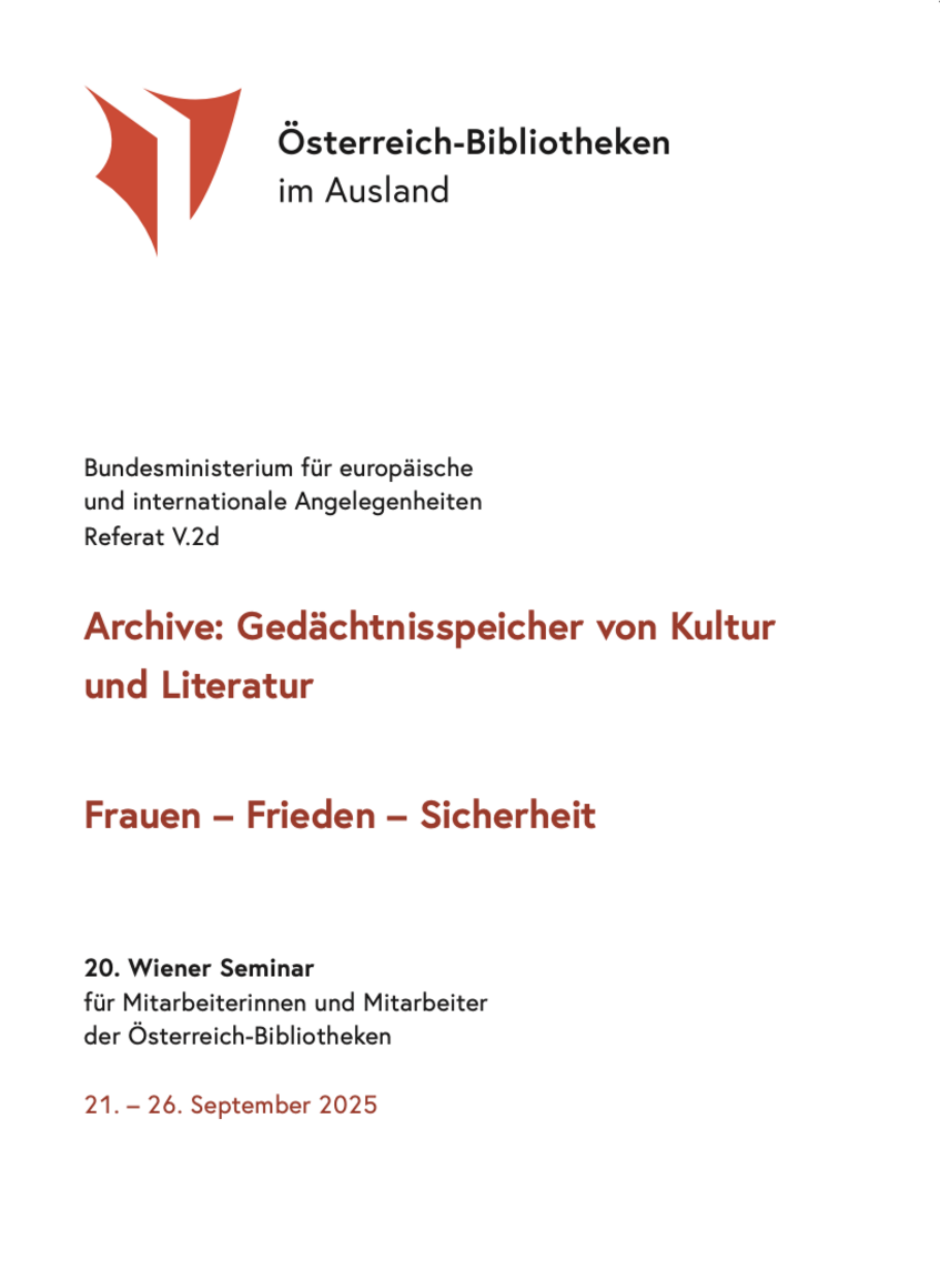 N.N.: 20. Wiener Seminar der Österreich-Bibliotheken im Ausland. https://www.oesterreich-bibliotheken.at/aktuelles/veranstaltungen/detail/20-wiener-seminar-der-oesterreich-bibliotheken-im-ausland (30.9.2025), datiert mit 21.-26.9.2025.