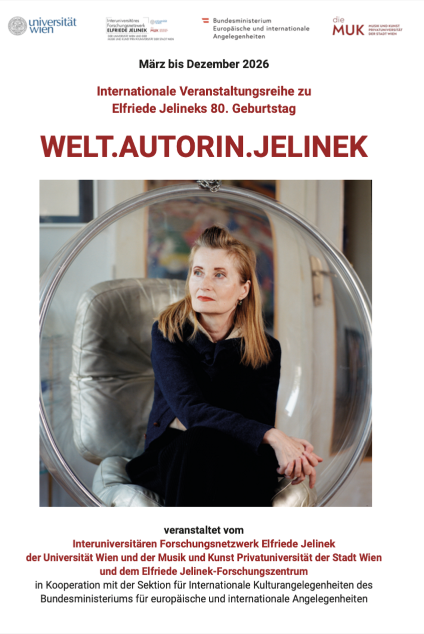 Die Internationale Veranstaltungsreihe WELT.AUTORIN.JELINEK, die aus Anlass von Elfriede Jelineks 80. Geburtstag stattfindet und aus sieben „Jelinek-Tagen“ im globalen Raum besteht, befasst sich mit Elfriede Jelinek als „Weltautorin“, die die aktuellen globalen antidemokratischen Entwicklungen mit Fokus auf die Position von Frauen* analysiert und deren Analysen weltweit wahrgenommen werden.